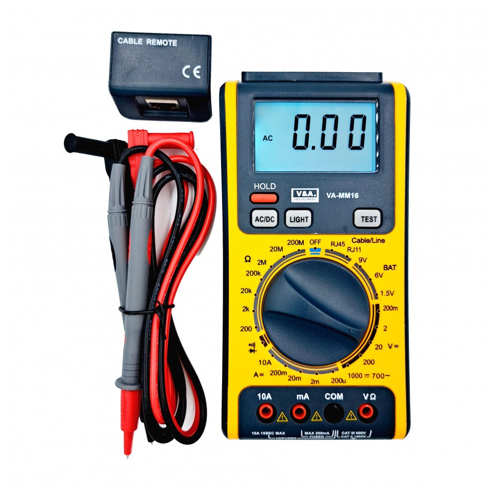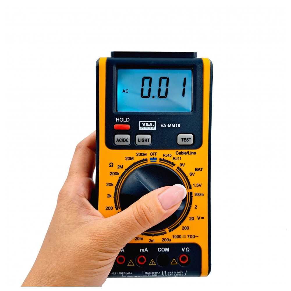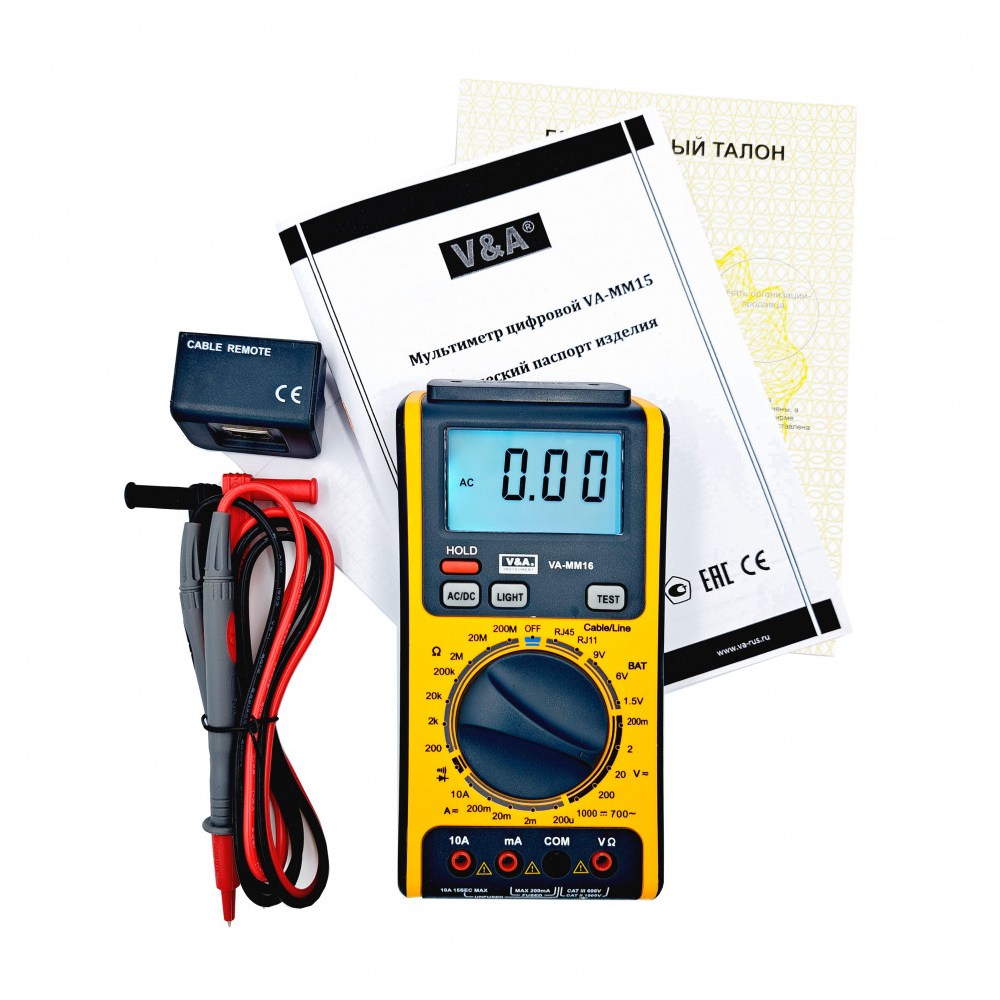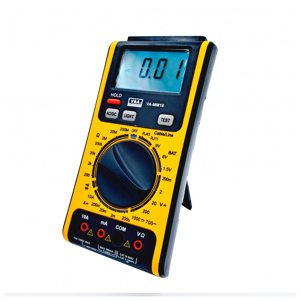 Особенность мультиметра VA-MM16: тестирование телефонных линий (RJ-11) и компьютерных сетей (RJ-45), стандарты T568A, T568B, 10Base-T, TokenRing Технические характеристики: