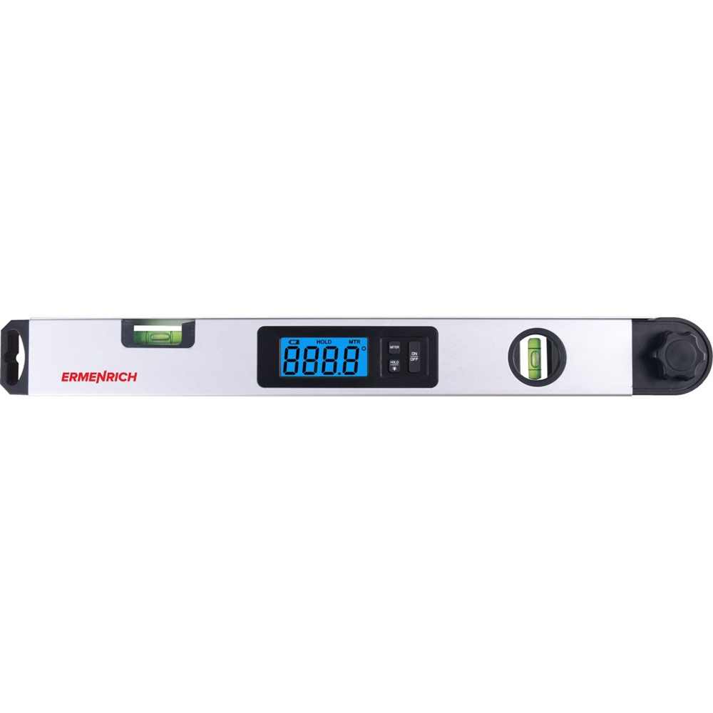 Угломер Ermenrich Verk DA40 проводит измерения в диапазоне 0–230 градусов. Корпус дополнен двумя встроенными пузырьковыми уровнями для точного позиционирования и отличается высокой прочностью: материалами для него послужили алюминий и ABS-пластик. Среди других преимуществ прибора – автоматическая калибровка и функция установки на ноль. Работает угломер от стандартной 9-вольтовой батарейки типа «Крона». Предусмотрена опция автоотключения, помогающая продлить срок работы прибора от одной батарейки.