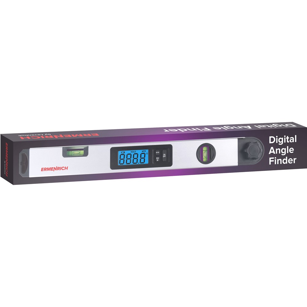 Ermenrich Verk DA40 – это цифровой угломер, который станет надежным помощником строителя, мастера по ремонту или монтажу оборудования. Прибор служит для точного измерения углов между поверхностями, а также может использоваться при распиловке длинных заготовок благодаря режиму расчета угла распила. Чтобы запустить этот режим, необходимо сохранить измеренное значение угла с помощью опции «Hold», а затем преобразовать его в величину угла среза, которая выставляется на торцовочной пиле. Управление функциями осуществляется с помощью удобных кнопок рядом с ЖК-экраном.