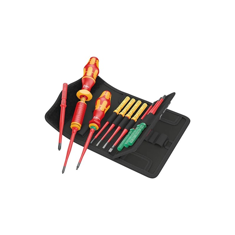 Набор сменных отвёрток VDE для динамометрической ручки-держателя. 16 предметов, включая 14 сменных отвёрток с защитной изоляцией (в т.ч. 12 с зауженным рабочим концом). С идентификатором инструментов Take it easy: цветовая кодировка профиля и лазерная гравировка размера для простого и быстрого отбора нужного инструмента. Динамометрическая ручка-держатель VDE с регулировкой момента затяжки 1,2-3,0 Нм и ручка-держатель 817 VDE. Обе с эргономичной ручкой Kraftform Plus, твёрдые зоны которой служат для высокой скорости работы, а мягкие зоны обеспечивают передачу больших моментов силы. Комплектация