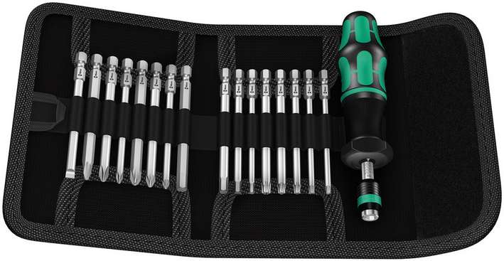 Складная сумка с битами длиной 89 мм. Набор включает динамометрическую отвёртку 7441 с быстрозажимным патроном „Rapidaptor" и многокомпонентной ручкой Kraftform для малоутомительной работы. Подходит для завинчиваний в ручном и машинном режимах. 17 предметов. Компактная система "Одна ручка – много насадок" для завинчиваний с контролем момента затяжки. Набор включает динамометрическую ручку-держатель 7441, диапазон значений 1,2 - 3,0 Нм. Установка с шагом 0,10 Нм. Простая установка необходимого значения без специального инструмента. Хорошо читаемая шкала. Технология Rapidaptor для моментальной смены битов. Неограниченный момент силы при отвинчивании трудноподдающихся винтов. Многокомпонентная ручка Kraftform с твёрдыми и мягкими зонами для высокой скорости работы и для щадящего контакта с ладонью. Набор включает 16 битов длиной 89 мм. В практичной складной сумке для хорошего обзора и удобного хранения инструментов.