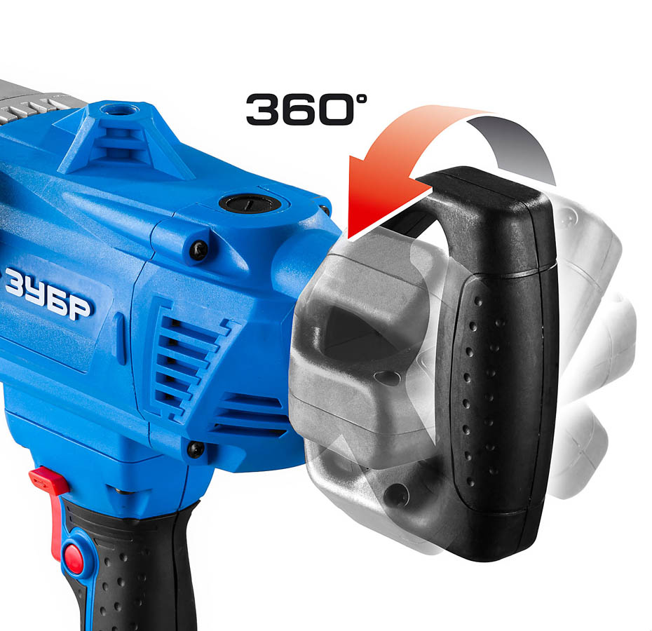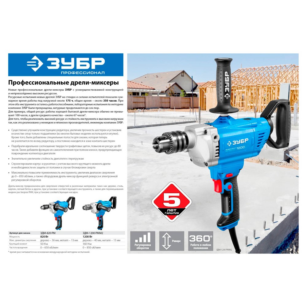 Миксер-дрель строительный ЗУБР ЗДМ-820 РМ, предназначен для сверления отверстий большого диаметра и размешивания различных растворов, краски и бетона. Высокий крутящий момент позволяет как сверлить глубокие отверстия большого диаметра, так и размешивать различные ЛКМ и даже бетон. Электронная регулировка частоты вращения позволяет начать размешивание без разбрызгивания и производить точное сверление отверстий. Металлический корпус редуктора обеспечивает большую стабильность геометрических размеров передачи, лучшее охлаждение редуктора в условиях повышенных нагрузок и, как следствие, большую надежность при долговременной работе. Ключевой патрон с максимальным диаметром 13 мм под любые хвостовики насадок. Фиксатор выключателя для длительных работ. Дополнительная эргономичная рукоятка с возможностью установки в трех положениях позволяет надежно удерживать инструмент с таким высоким крутящим моментом при любой работе. Вспомогательная тыльная вращающаяся рукоятка обеспечивает удобный хват при использовании изделия