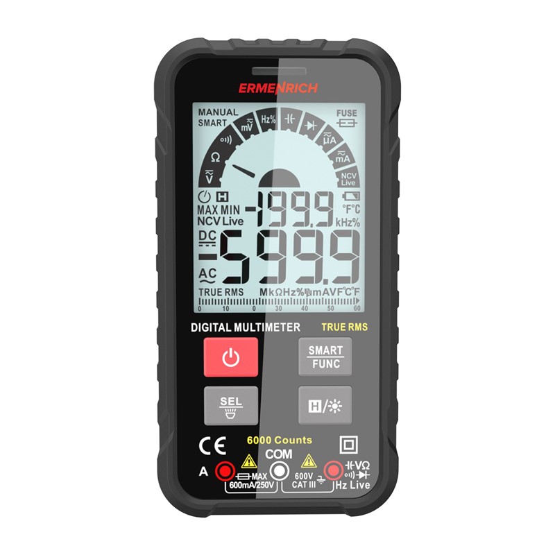 Цифровой мультиметр Ermenrich Zing TC19 измеряет разные параметры электрической сети: напряжение, силу тока, сопротивление, емкость, частоту, рабочий цикл. Также он служит для определения целости линии (прозвонки кабеля), проверки диодов на пробои и обрывы, бесконтактного поиска скрытой проводки (NCV) и детектирования опасного напряжения. Прибор размером с мобильный телефон полностью помещается в кармане. Корпус изготовлен из пластика, имеет ребра для удобного хвата и не скользит в руке во время работы.