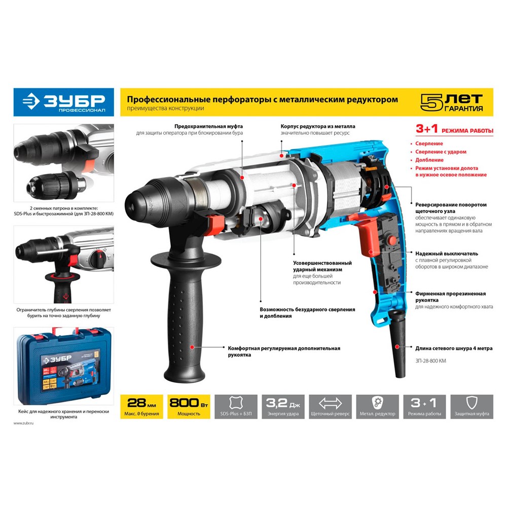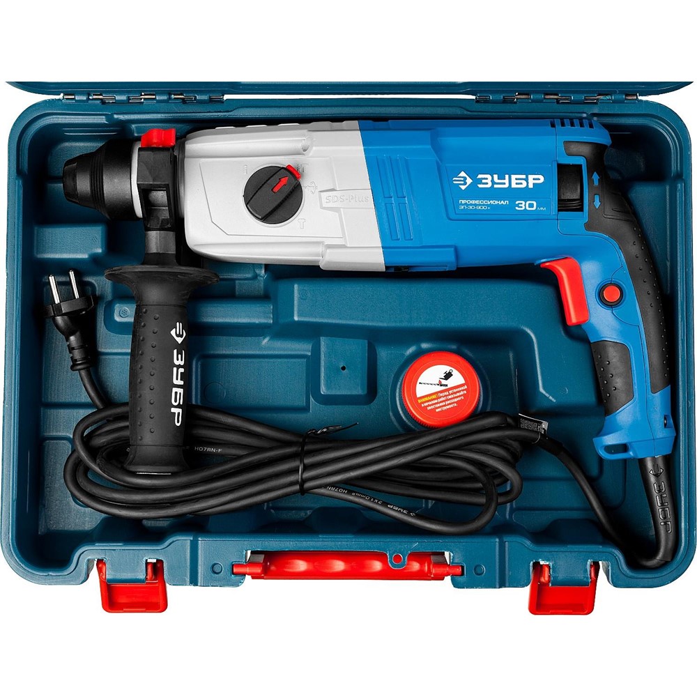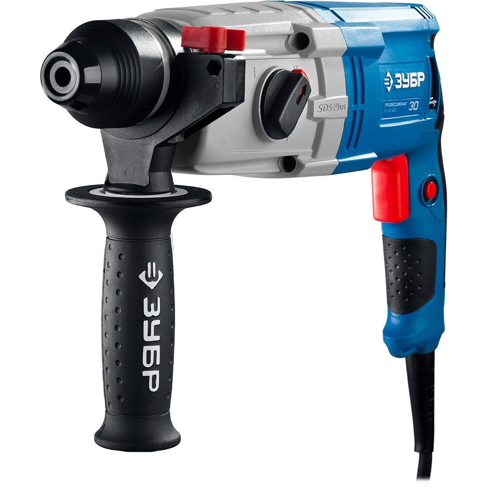 Перфоратор ЗУБР ЗП-30-900 К, предназначен для сверления отверстий в различных материалах (дерево, сталь, бетон, кирпич и т. д.) в режимах сверления и сверления с ударом, а также для работы с долотом в режиме «удар». Перфоратор большой мощности, идеально подходит для самых напряженных работ. Фирменный дизайн и ударный механизм с запасом мощности для еще большей производительности. Корпус редуктора из литого под давлением алюминия позволяет получить от изделия максимум без ущерба для надежности. Увеличенные диаметр и скорость бурения для большей производительности. Функции долбления и сверления без удара придают дополнительную функциональность. Патрон SDS-Plus для быстрой замены расходного инструмента. Реализация реверсирования поворотом щеточного узла обеспечивает одинаковую мощность как в прямом, так и в обратном направлениях вращения вала. Предохранительная муфта для защиты оператора при блокировании бура. Плавная регулировка оборотов в широком диапазоне для точности на низких оборотах и производительности.