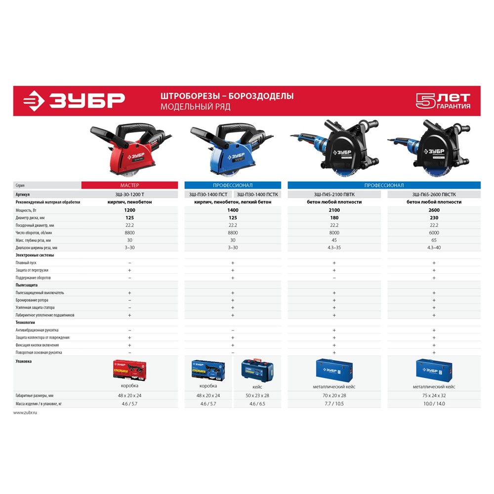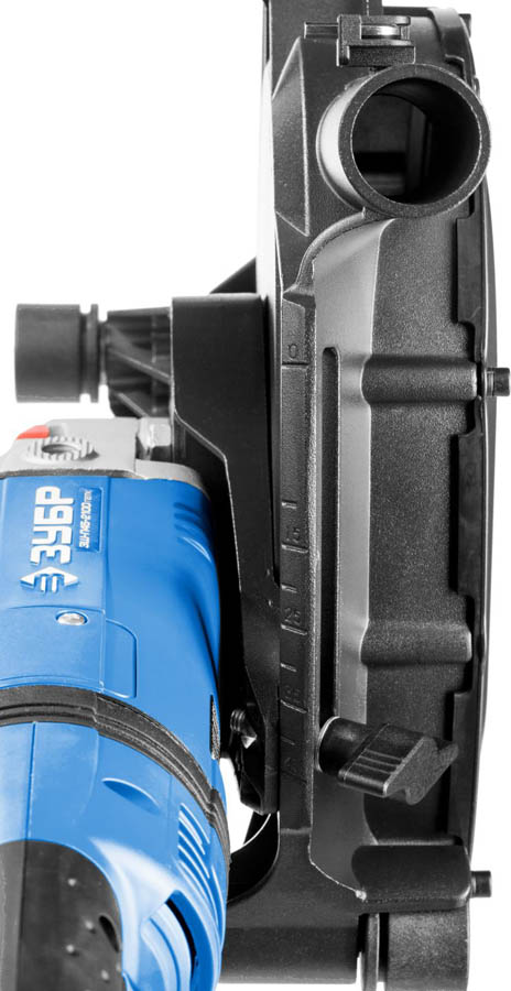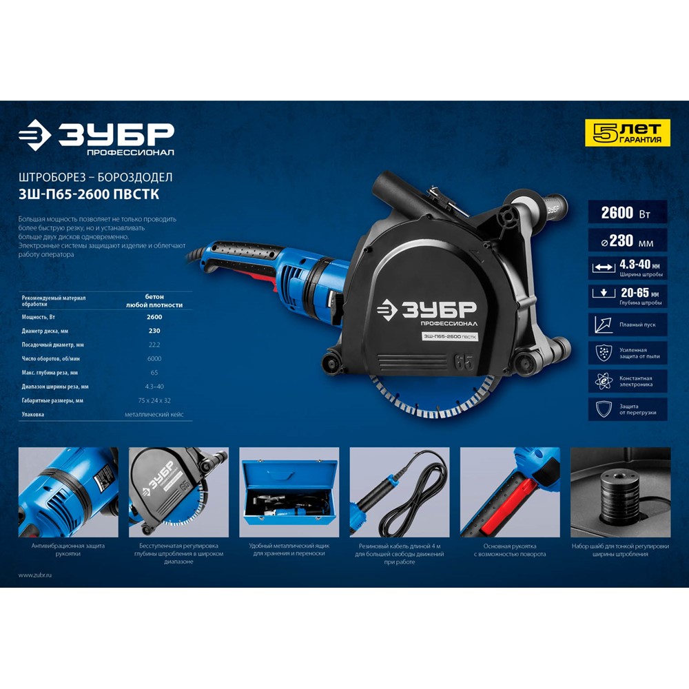 Штроборез ЗУБР ЗШ-П65-2600 ПВСТК, предназначен для выполнения штроб в наиболее прочных бетонах. Профессиональный штроборез со всеми возможными вспомогательными системами и надежной конструкцией для ответственных работ. Полная пылезащита всех узлов обеспечивает изделию надежность и долгий срок службы. Бесступенчатая регулировка глубины пропила с удобной шкалой и фиксацией без инструмента. Простая регулировка ширины штробы с шагом 3 мм с помощью наборных шайб. Система погружения дисков - это удобное начало работы с плавным введением дисков в контакт с поверхностью. Специально усиленный корпус редуктора для улучшения теплоотвода и обеспечения прочности самого нагруженного узла. Удобная блокировка шпинделя для легкой замены дисков. Закрывающий зону работы подпружиненный кожух предотвращает разброс продуктов реза при любой глубине штробы. Самоотключающиеся щетки со сроком службы >120 часов и простой заменой. Удобный фирменный кейс для хранения и переноски.